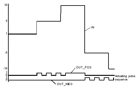 In the examples, the signal sequences on the outputs OUT_POS and OUT_NEG are shown for various IN input signal values.