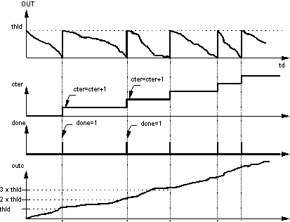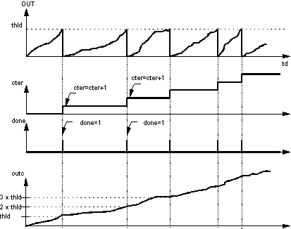 As soon as the output OUT exceeds the threshold value thld, the output done is set to 1. During the execution of the function block they are set to zero again.