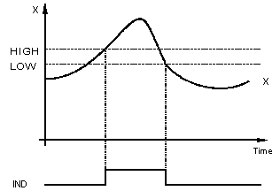 If LOW is greater than HIGH, no hysterisis is created and IND indicates that X is greater than HIGH.