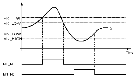 If X exceeds the value of MN_LOW, the function block reports this status with MN_IND = 0.