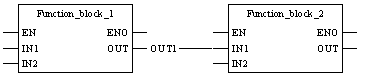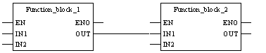 If EN from FunctionBlock_1 is set to "0", the output connection OUT from FunctionBlock_1 retains the status it had in the last correctly executed cycle. The variable OUT1 on the same pin, either retains its previous status or can be changed externally without influencing the connection. The variable and the link are saved independently of each other.