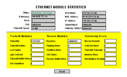 The Ethernet Module Statistics page provides information about the status, transmit and receive statistics, and detected errors for the Embedded Server module. Access this page by selecting the NOE module from the local rack or use the hyperlink Statistics. The following graphic is an example Ethernet Module Statistics page: