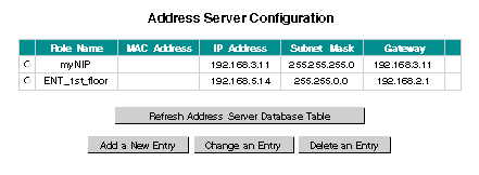 To configure the Address Server you use Web pages generated by the embedded Web server. The first page that appears is the Address Server Configuration page. The first column contains buttons used for selecting devices. The Address Server Configuration page displays configuration information for each device in the system and has seven columns in the table.