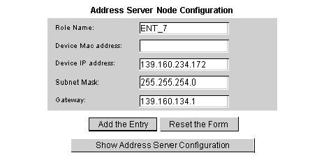 When the Add a New Entry button is selected, the Address Server Node Configuration page appears. This page displays information about a device.