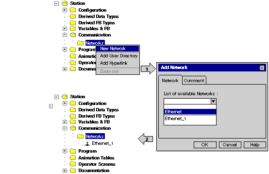 After starting a new application, the Communication folder under the Station tree branches the Network folder and the Routing table folder (Premium platforms only). These two folders are empty. Under the Network folder, the user can insert the networks by menu. A click on the right mouse-button above Network pops up a contextual menu. The user selects the type of network he wants to add. For easier use, a network name will be suggested with the prefix of the network type (Ethernet_1 or Modbus+_1). By choosing a new network the next available number for the network is chosen automatically, for example, Ethernet_1 then Ethernet_2 and so on. At any moment, the user may rename any Netlink.