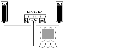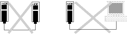 Schneider Electric recommends that you connect an NOE module to another NOE module or other device through a hub or a switch (as shown in the following correct network topology graphic).