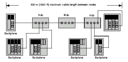 The figures and tables that follow show the maximum number of hubs and the maximum cable length between nodes allowed if using hubs.