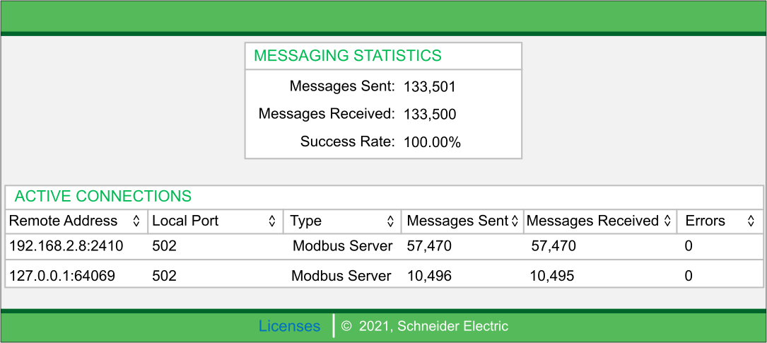 This page shows current information for open Modbus TCP connections on port 502: