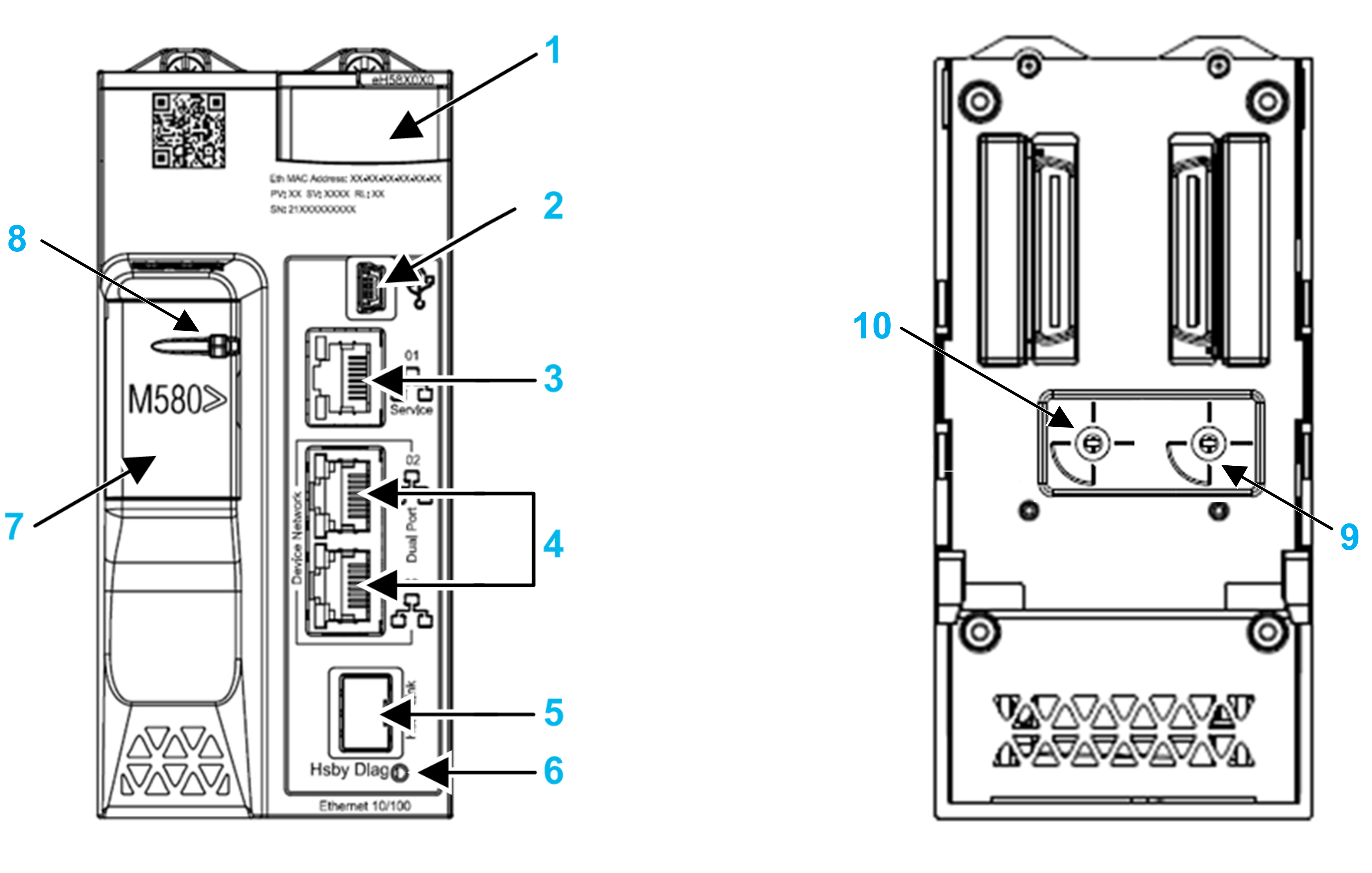 The three Hot Standby CPU modules have the same external hardware features. The front of the module is on the left. The back of the module is on the right: