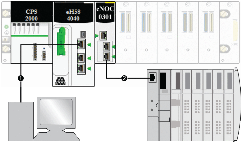 1 The M580 CPU (with DIO scanner service) on the local rack is connected to a PC that runs the Control Expert software.