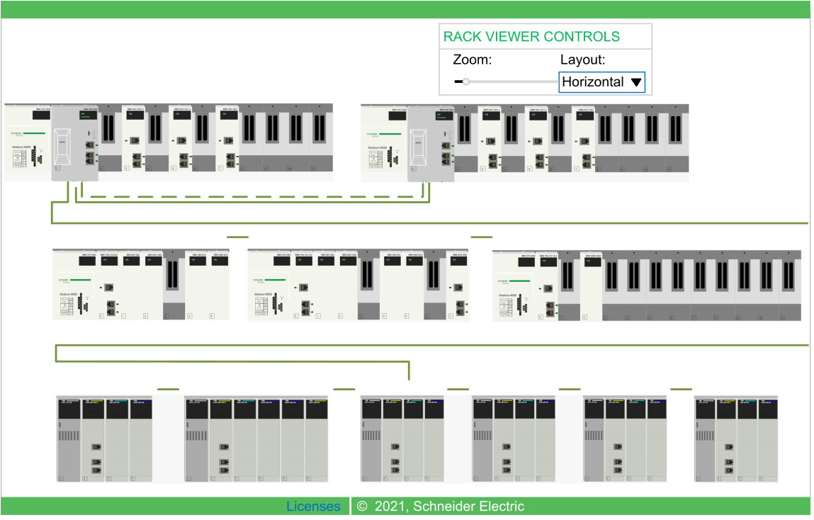 This example of a Rack Viewer page shows the Hot Standby connection between a primary CPU rack and a standby CPU rack. The Hot Standby connection (dashed line) is green when the Hot Standby link is healthy. If the Hot Standby link is not healthy, the dashed line is red.